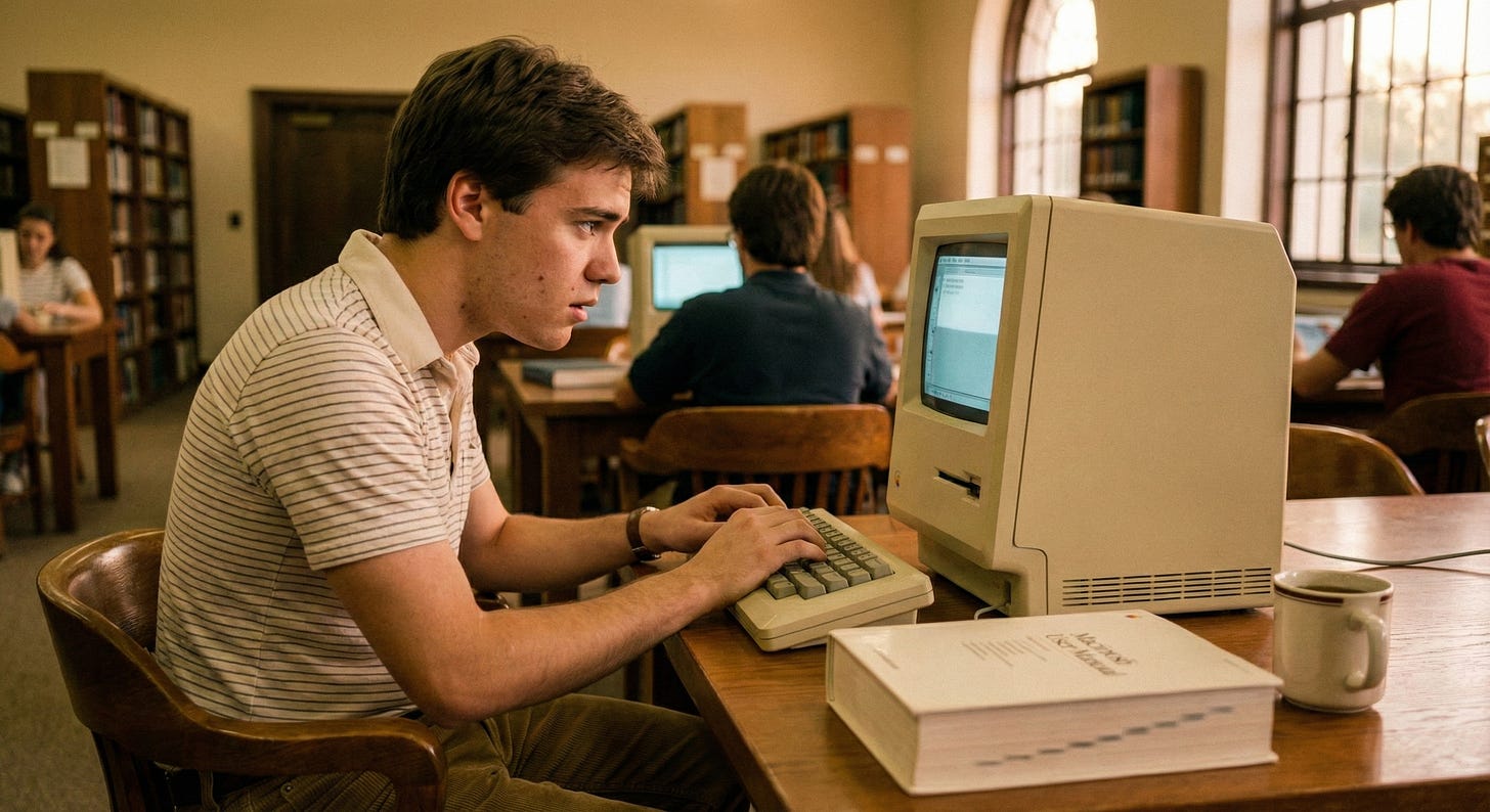 It was 1984 or early 1985. The library at the University of North Carolina Wilmington. I was a freshman, and there were juniors and sophomores moving through the graphical interface like they’d been born there. Clicking, dragging, ejecting floppy disks with casual confidence. I didn’t even know how to manage the disk. The beige box sat there humming, its 9-inch monochrome screen waiting, and I felt the particular anxiety of standing at the edge of something I didn’t yet understand but knew I needed.