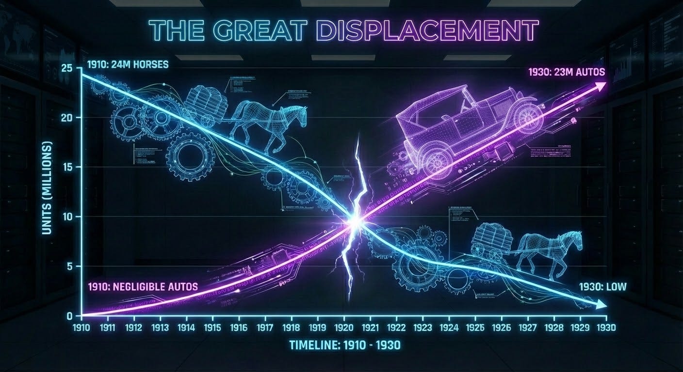 In 1910, America stabled approximately 24 million horses and mules. By 1930, we had registered 23 million automobiles. In a single generation, the animal that had powered human civilization for five thousand years was replaced by a machine that had existed for barely two decades.