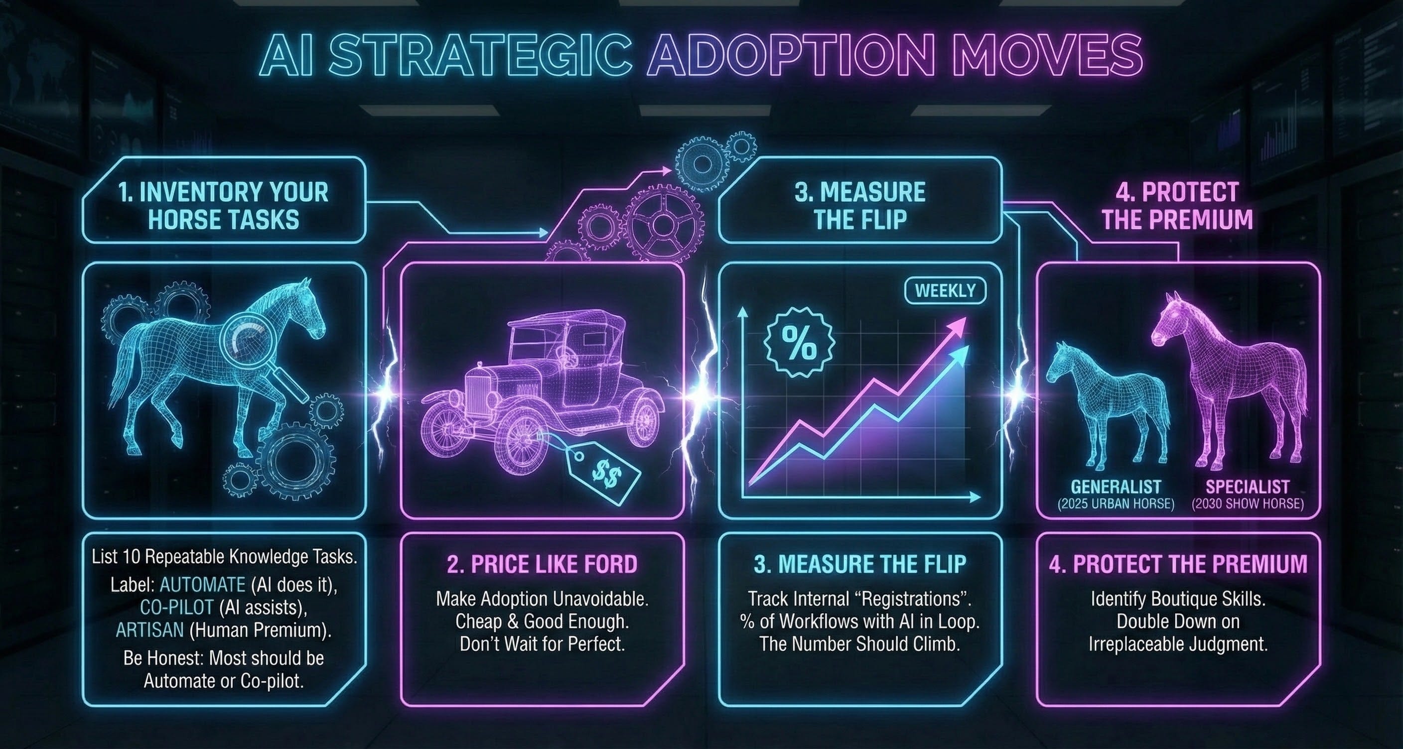Inventory your horse tasks. List ten repeatable knowledge tasks in your work. Label each one: automate (AI does it), co-pilot (AI assists), or artisan (human premium). Be honest. Most of your list should be in the first two categories.