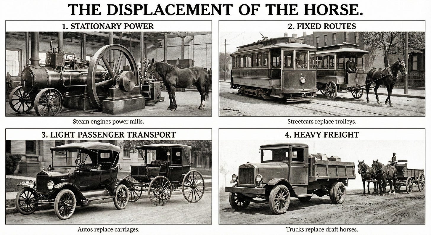 Here’s what I find most instructive: the horse didn’t disappear all at once. It was displaced function by function, in a predictable sequence.