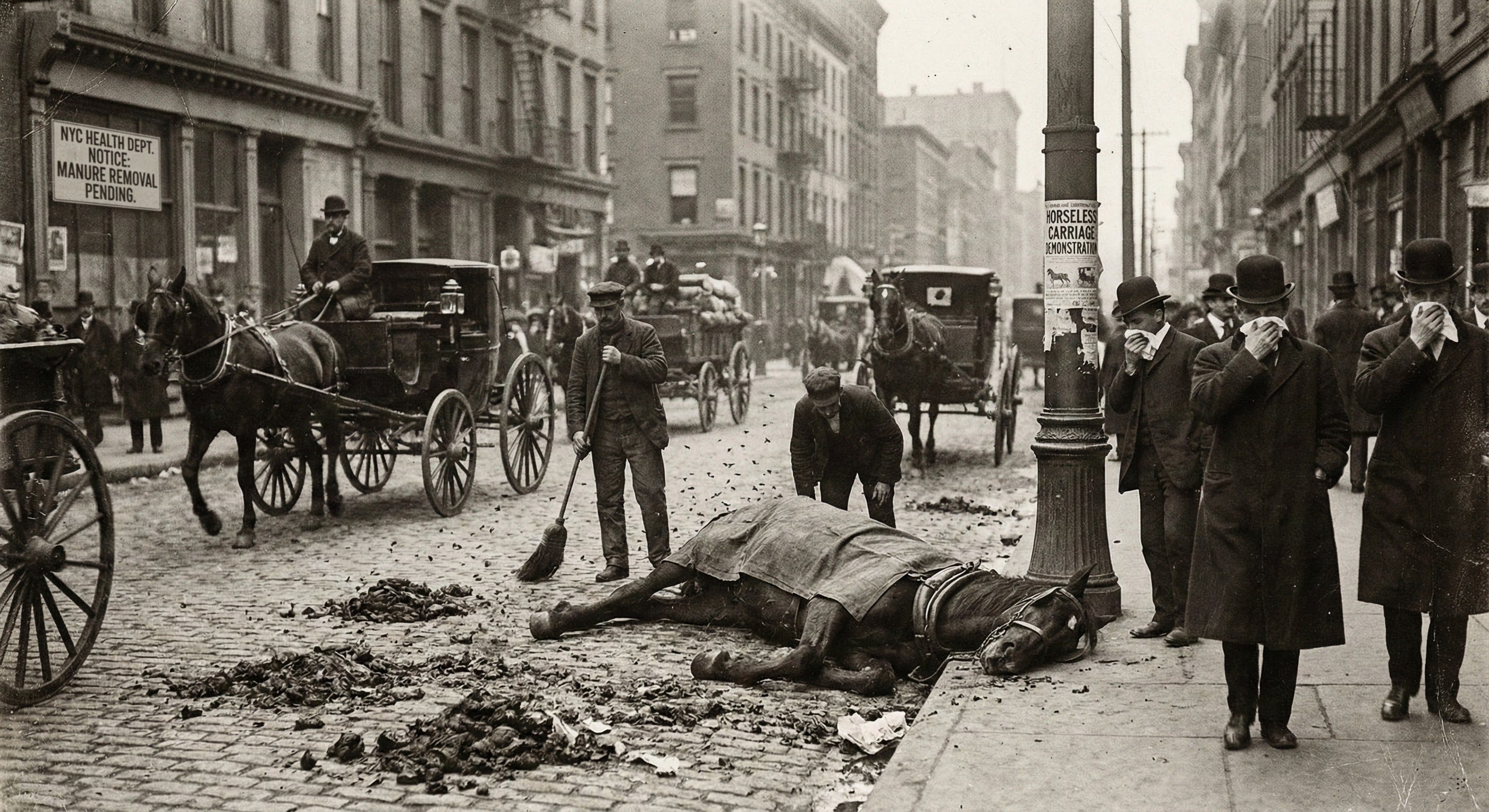 In 1900, New York City maintained approximately 128,000 horses. Each horse produced 20 to 30 pounds of manure per day. Do the math. That’s nearly two million pounds of waste hitting the streets daily in a single city. Add urine. Add the carcasses of horses that collapsed and died in the streets, sometimes left for days because removal was expensive. Add the flies, the disease, the smell that permeated everything.
